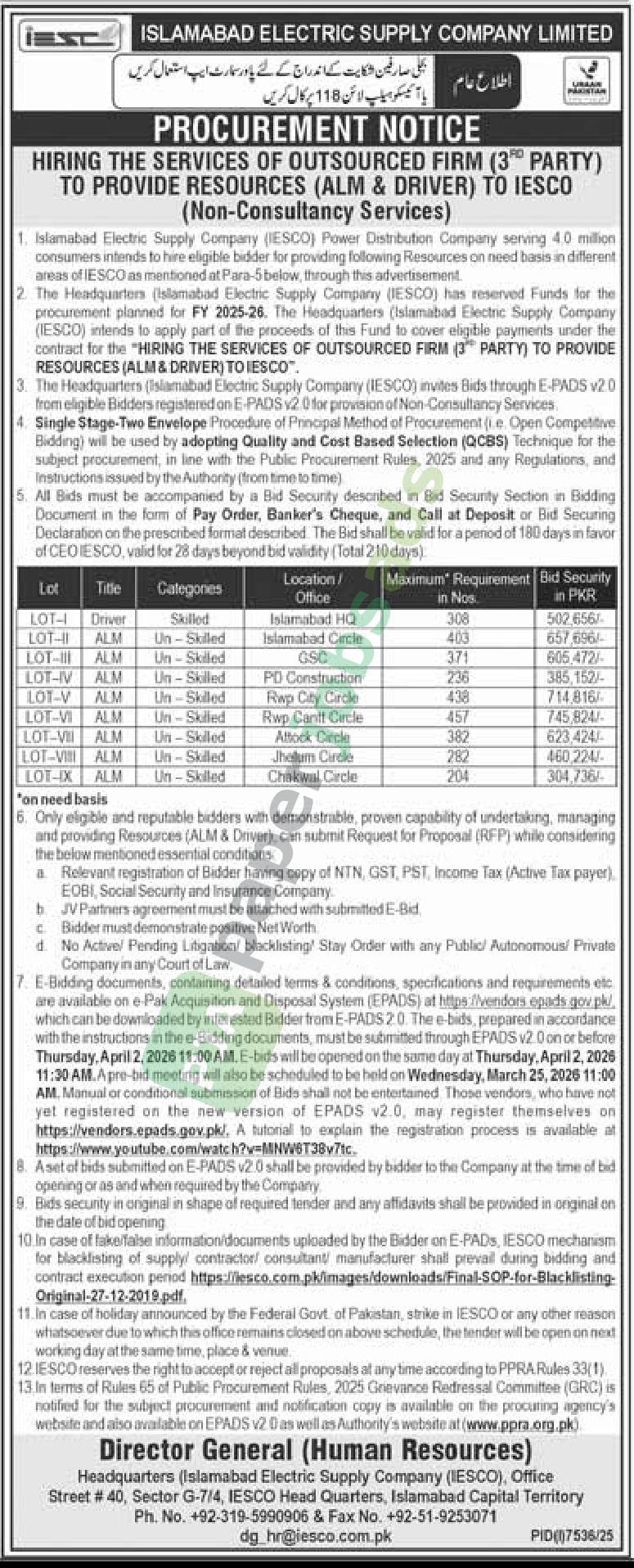 3. The Headquarters (Islamabad Electric Supply Company (IESCO) invites Bids through E-PADS v2.0