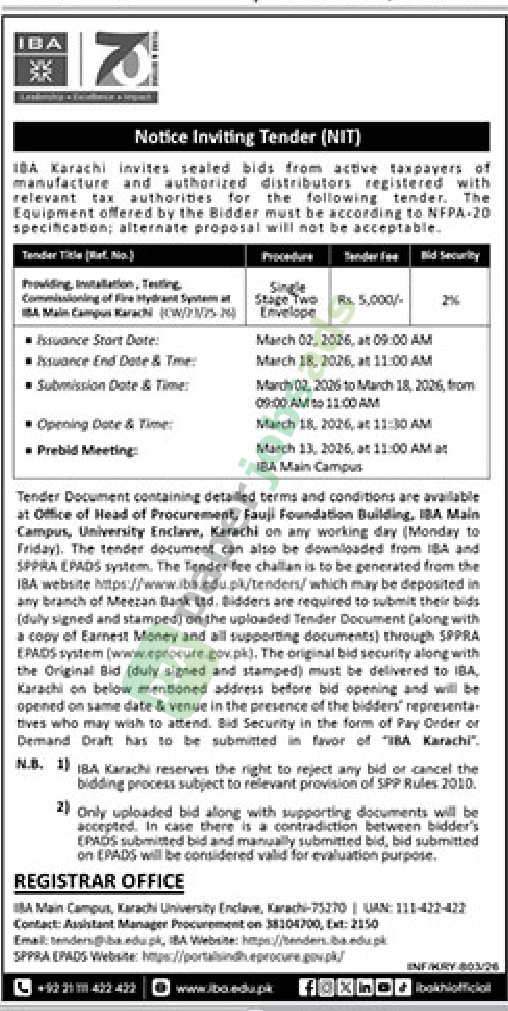 A government tender notice has been issued by IBA, Karachi. The bid submission deadline is 18 March 2026. Originally published in Daily Jang on 3 March 2026.