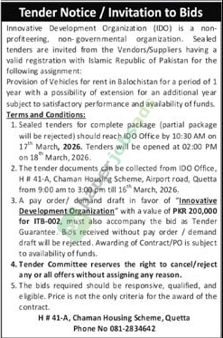 A ngo tender notice has been issued by Innovative Development Organization (IDO), Quetta. The bid submission deadline is 17 March 2026. Originally published in Daily Jang on 3 March 2026.