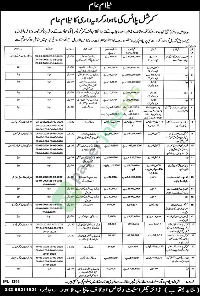 ہر خاص و عام کو مطلع کیا جاتا ہے کہ محکمہ اوقاف و مذہبی امور پنجاب کے زیر انتظام وقف کمرشل / رہائشی حیثیت کے حامل پالانس کو درج ذیل شیڈول