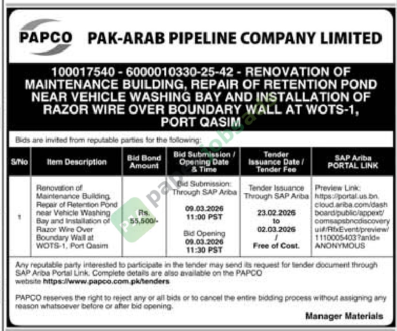 A government tender notice has been issued by PAPCO, Karachi. The bid submission deadline is 9 March 2026. Originally published in Daily Jang on 23 February 2026.