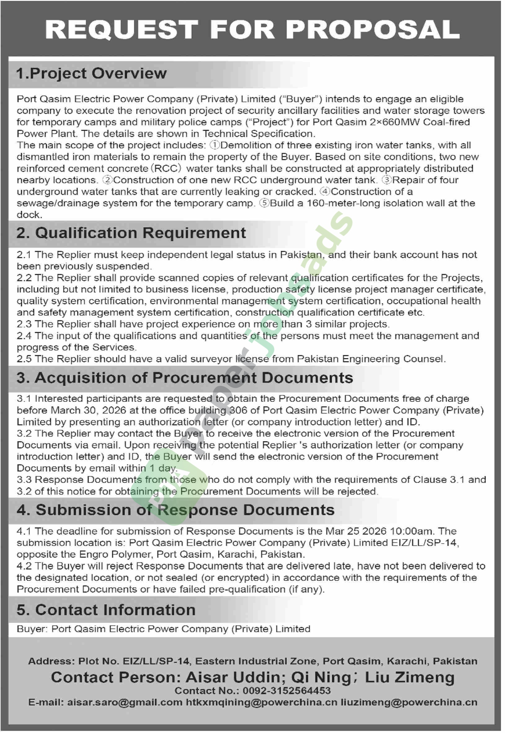 for temporary camps and military police camps (“Project”) for Port Qasim 2×660MW Coal-fired