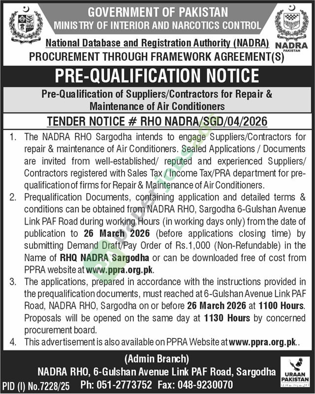 Road, NADRA RHO, Sargodha on or before 26 March 2026 at 1100 Hours.