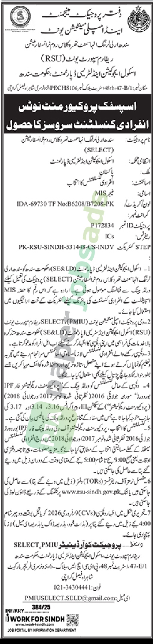 (RSU) اسکول ایجوکیشن اینڈ سٹریسی ڈپارٹمنٹ (SERLD) حکومت سندھ متذکرہ