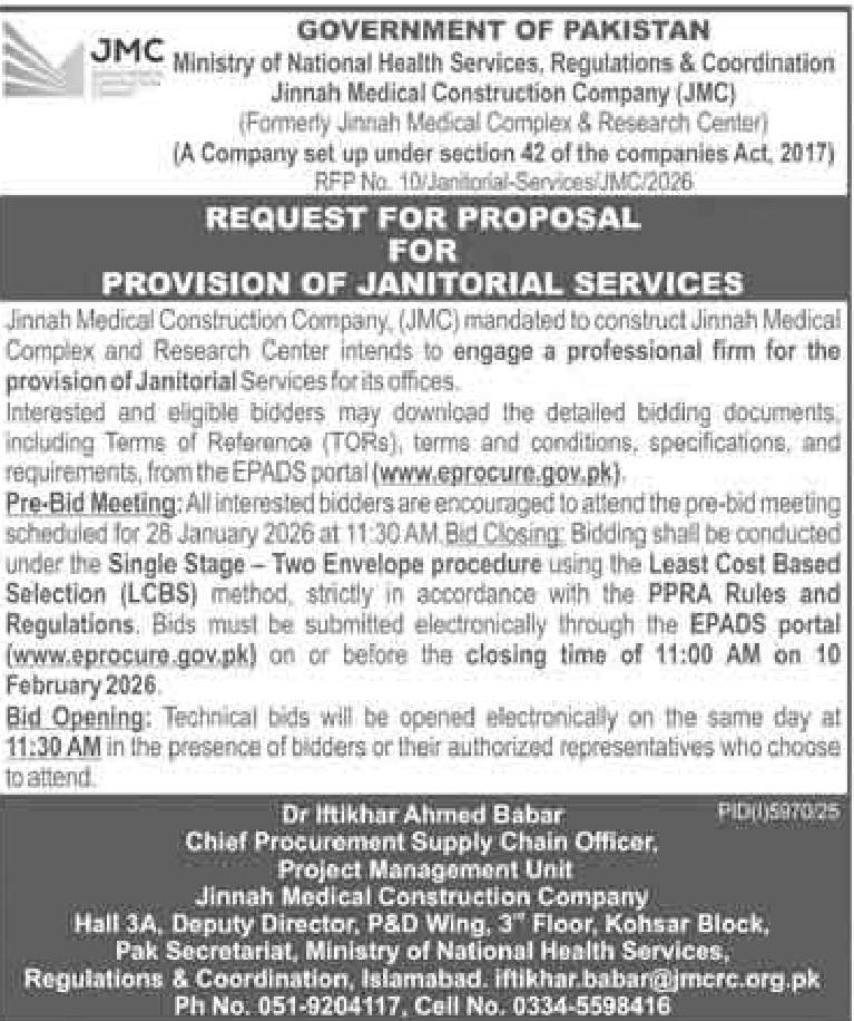 A government tender notice has been issued by Ministry of National Health Services, Regulations & Coordination, Islamabad. The bid submission deadline is 10 February 2026. Originally published in Daily Jang on 22 January 2026.