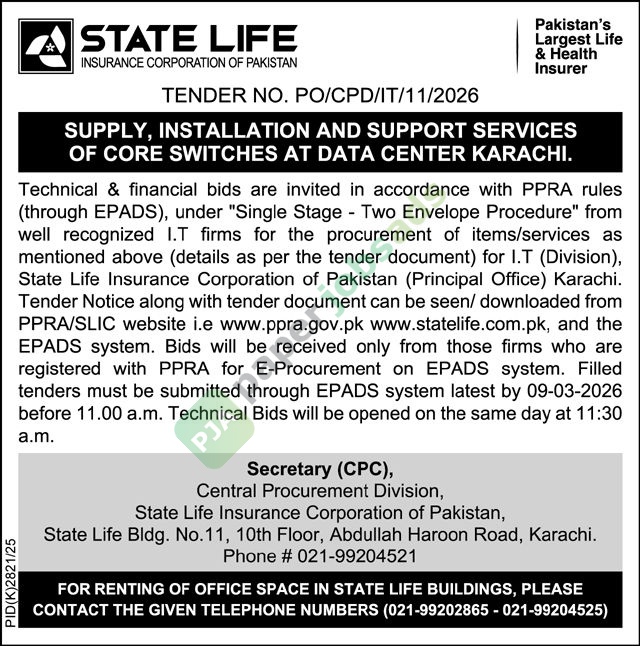 A government tender notice has been issued by State Life Insurance Corporation of Pakistan, Karachi. The bid submission deadline is 9 March 2026. Originally published in The Nation on 22 February 2026.