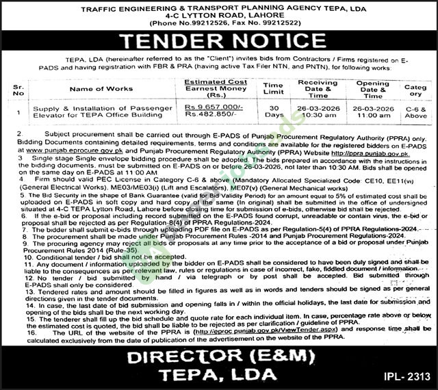 A government tender notice has been issued by TRAFFIC ENGINEERING & TRANSPORT PLANNING AGENCY TEPA, LDA, Lahore. The bid submission deadline is 26 March 2026. Originally published in The Nation on 4 March 2026.
