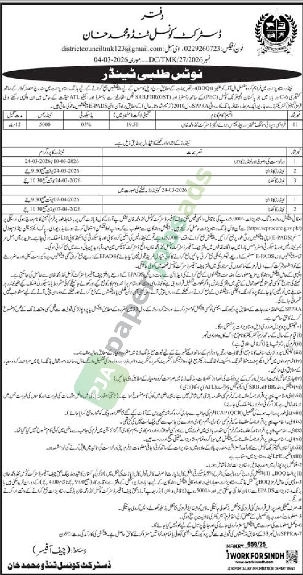 A government tender notice has been issued by DISTRICT COUNCIL, Tando Muhammad Khan. The bid submission deadline is 24 March 2026. Originally published in Daily Jang on 8 March 2026.