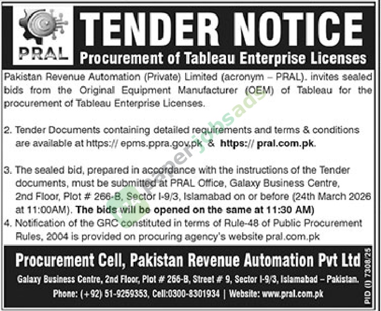 A government tender notice has been issued by Pakistan Revenue Automation (Private) Limited, Islamabad. The bid submission deadline is 24 March 2026. Originally published in Daily Jang on 10 March 2026.