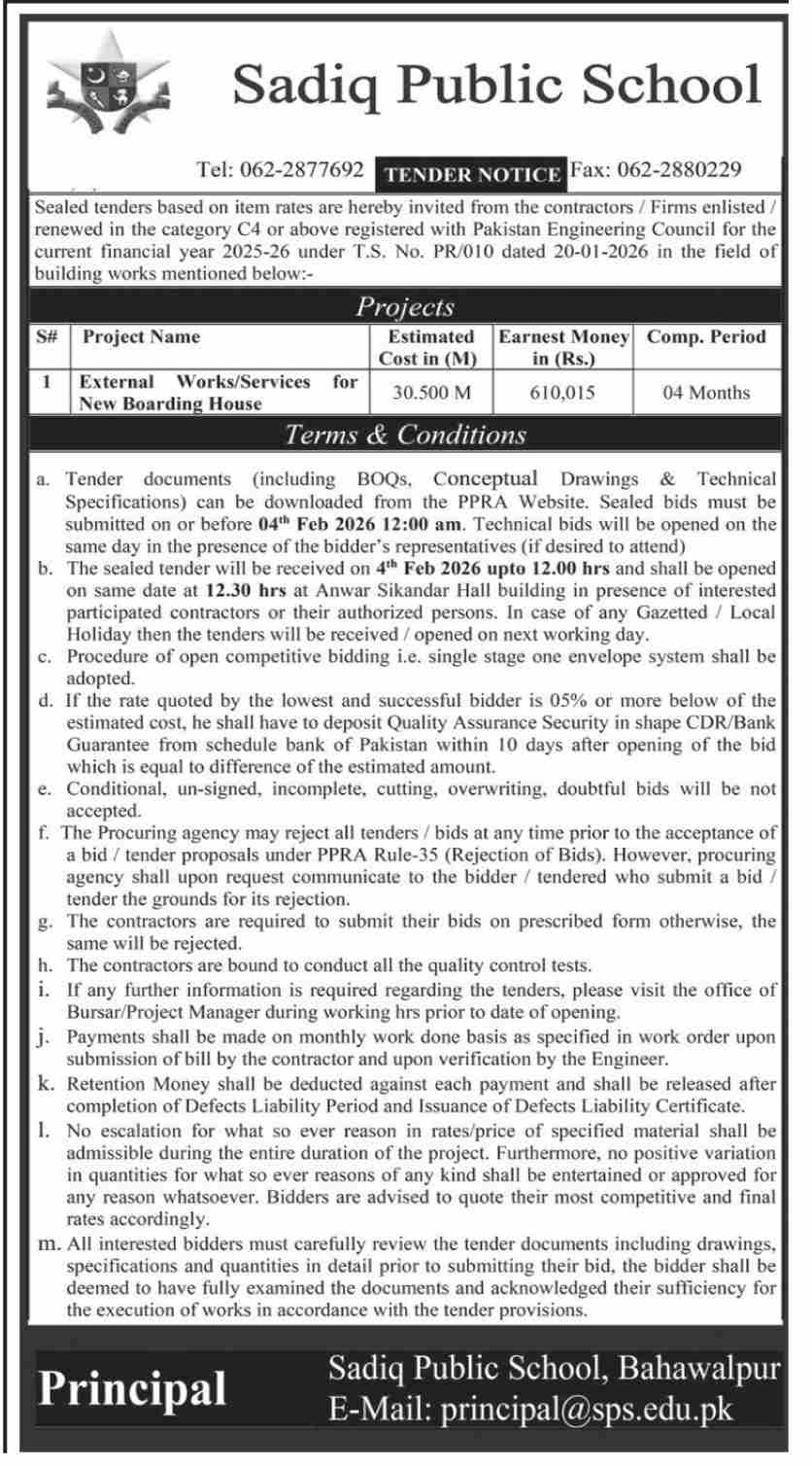 A private tender notice has been issued by Sadiq Public School, Bahawalpur. The bid submission deadline is 4 February 2026. Originally published in Daily Jang on 21 January 2026.