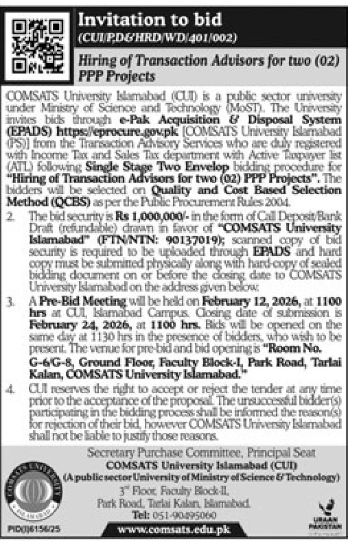 A private tender notice has been issued by COMSATS University, Islamabad. The bid submission deadline is 12 February 2026. Originally published in Daily Jang on 27 January 2026.