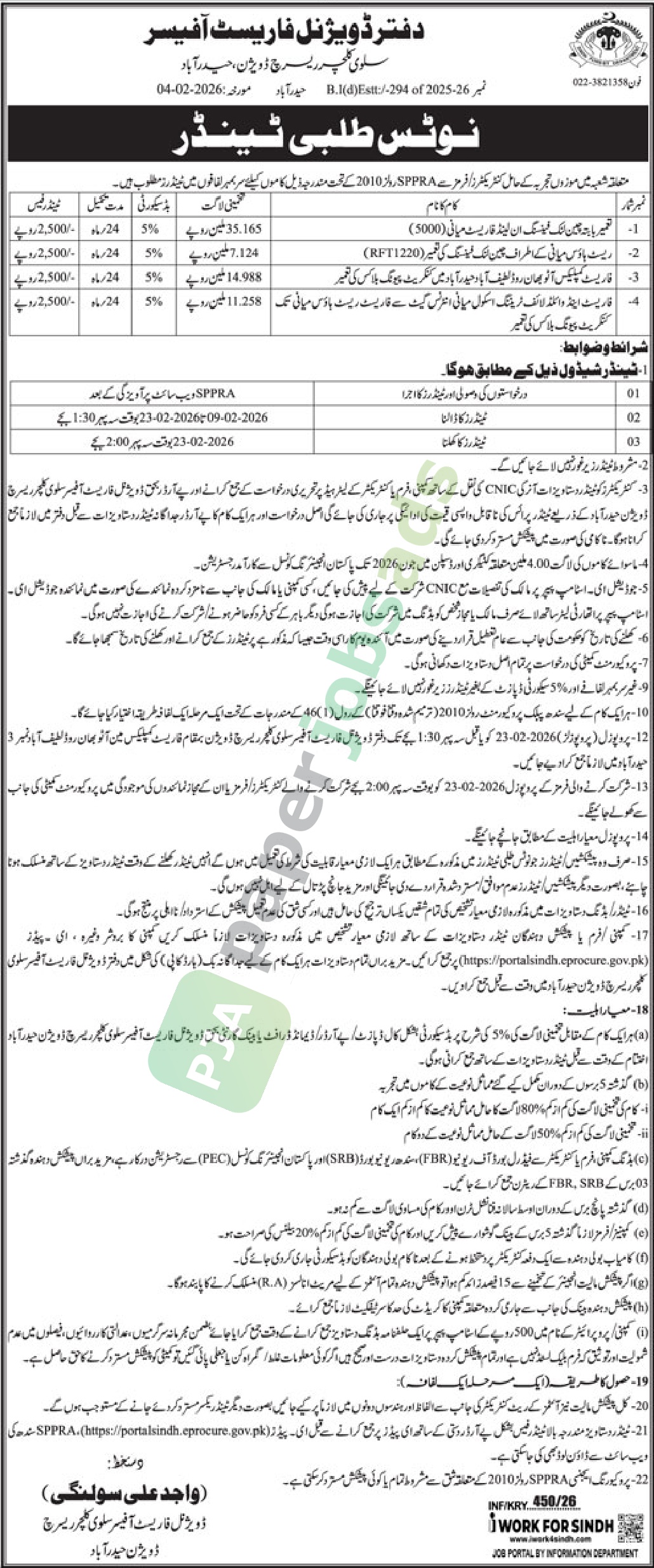 (https://portalsindh.eprocure.gov.pk) پر جمع کرائیں۔ مزید براں تمام دستاویزات ہر ایک کام کے لیے جدا گانہ بک (ہارڈ کاپی ) کی شکل میں دفتر ڈویژنل فاریسٹ آفیسر سلوی