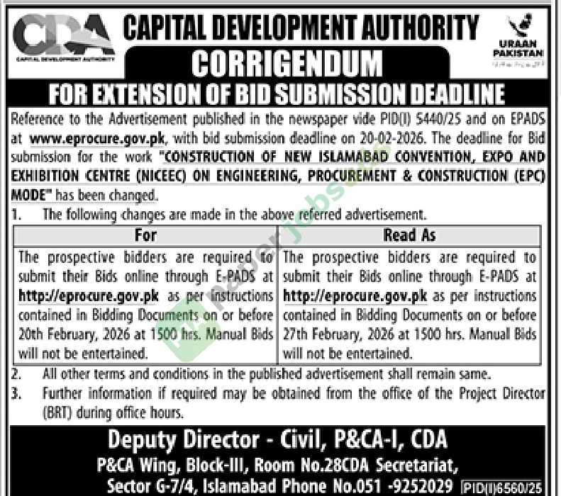 A government tender notice has been issued by CDA, Islamabad. The bid submission deadline is 27 February 2026. Originally published in Daily Jang on 11 February 2026.