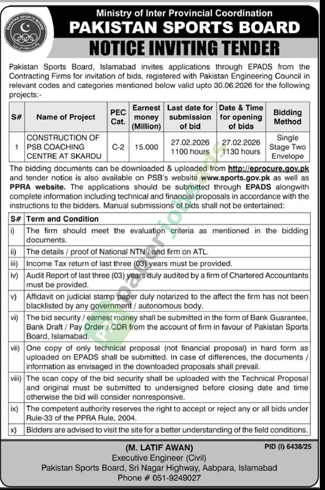 and tender notice is also available on PSB’s website www.sports.gov.pk as well as