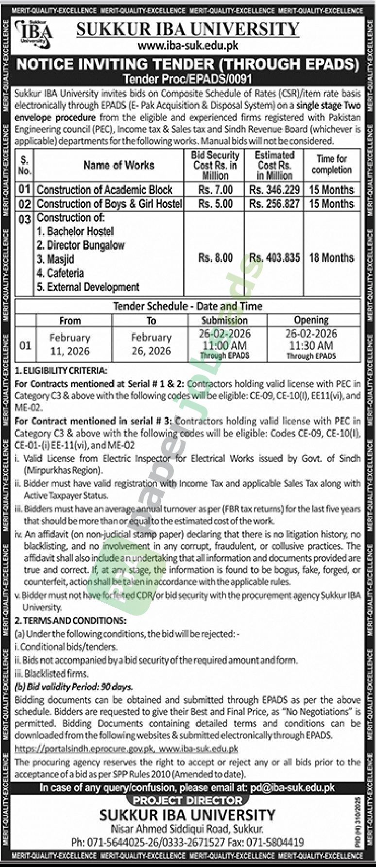 Sukkur IBA University invites bids on Composite Schedule of Rates (CSR)/item rate basis