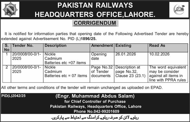 Tender Notice – Office of the Chief Electrical Engineer P.R. Headquarters – Lahore