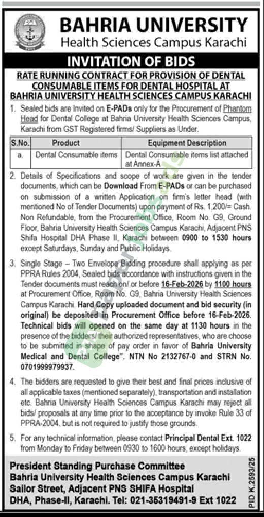 A government tender notice has been issued by BAHRIA UNIVERSITY, Karachi. The bid submission deadline is 16 February 2026. Originally published in Daily Jang on 1 February 2026.