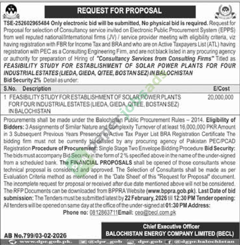 A government tender notice has been issued by Balochistan Energy Company Limited, Balochistan. The bid submission deadline is 22 February 2026. Originally published in Daily Jang on 5 February 2026.