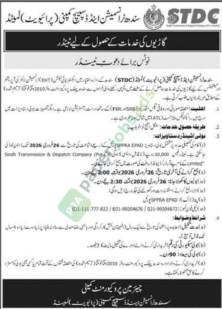 A government tender notice has been issued by Sindh Transmission & Dispatch Company (Pvt.) Limited (STDC), Karachi. The bid submission deadline is 26 February 2026. Originally published in Daily Jang on 5 February 2026.