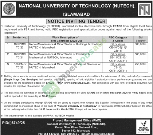 A government tender notice has been issued by National University of Technology, Islamabad. The bid submission deadline is 5 March 2026. Originally published in Daily Jang on 18 February 2026.