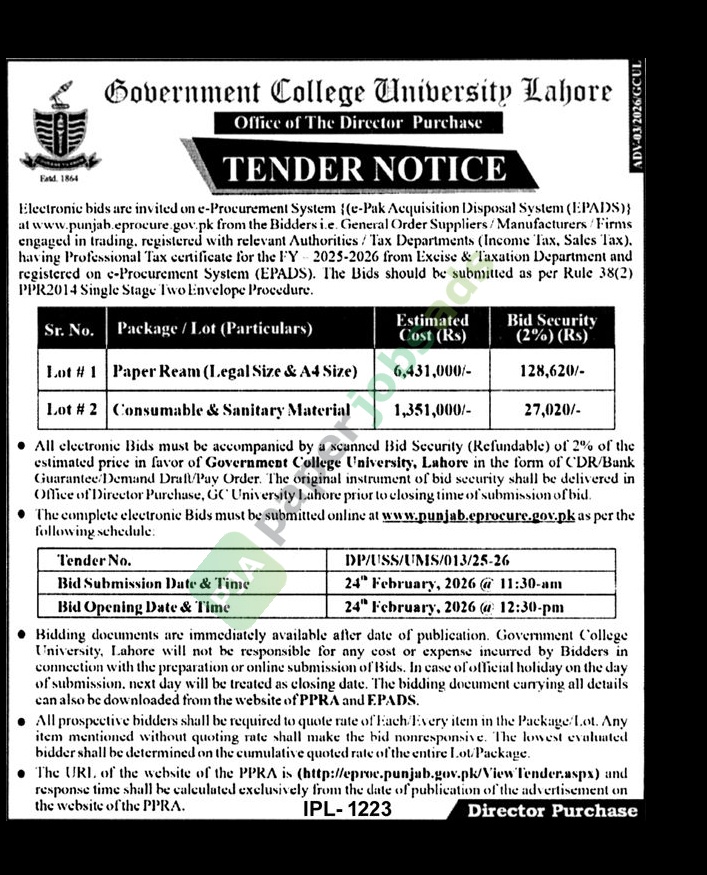 A government tender notice has been issued by Government College University, Lahore. The bid submission deadline is 24 February 2026. Originally published in The Nation on 1 February 2026.