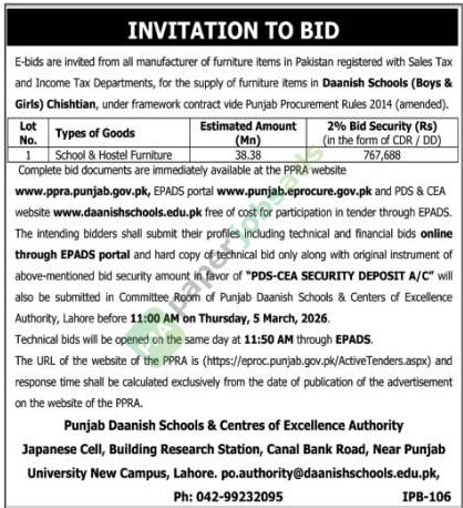 A government tender notice has been issued by DAANISH SCHOOLS AUTHORITY, Lahore. The bid submission deadline is 5 March 2026. Originally published in The Nation on 19 February 2026.