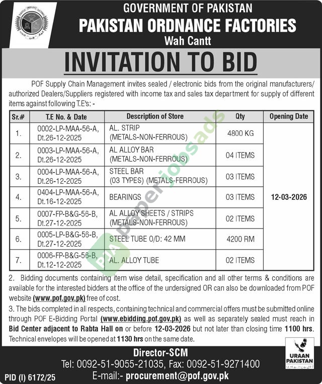 A government tender notice has been issued by Pakistan Ordnance Factories, Wah. The bid submission deadline is 12 March 2026. Originally published in The Nation on 28 January 2026.