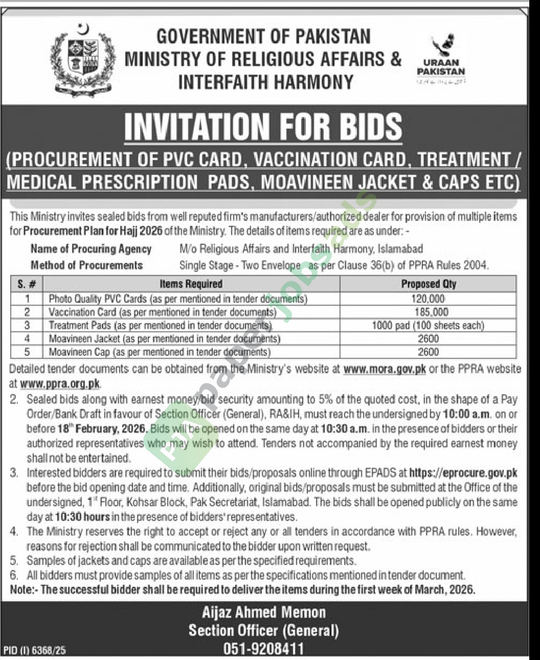 Detailed tender documents can be obtained from the Ministry’s website at www.mora.gov.pk or the PPRA website