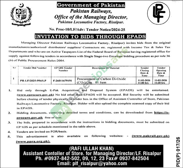 Managing Director Pakistan Railways Locomotive Factory, Risalpur) invites bids from the original