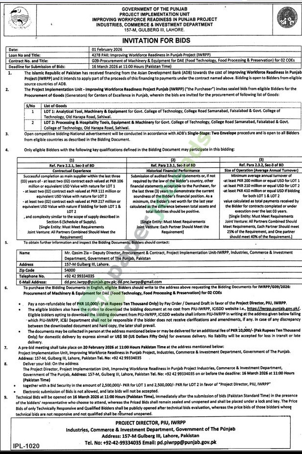 Government of The Punjab, Address: 157-M, Gulberg III, Lahore, Pakistan Tel. No: +92 42 99334035 on or before the deadline: 16 March 2026 at 11:00 Hours