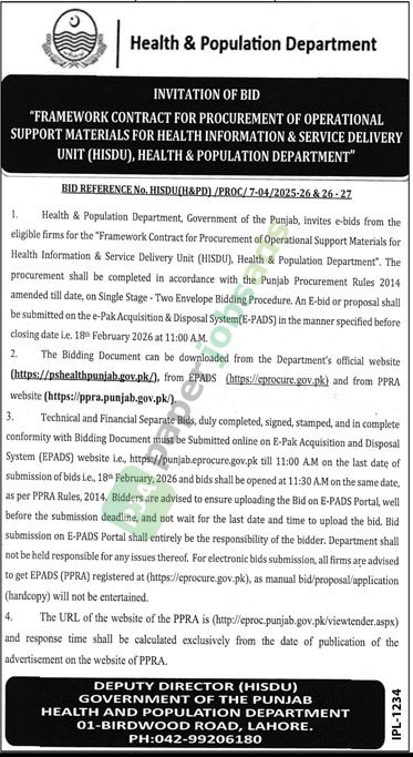 A government tender notice has been issued by Health & Population Department, Lahore. The bid submission deadline is 18 February 2026. Originally published in Daily Jang on 2 February 2026.