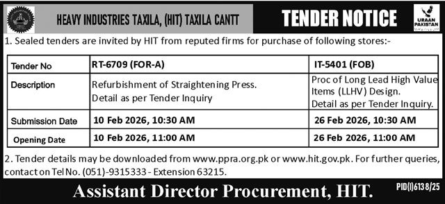 Tender Notice – HEAVY INDUSTRIES TAXILA, (HIT) TAXILA CANTT
