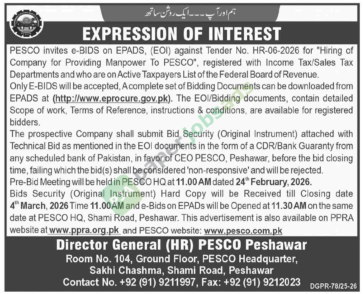 PESCO invites e-BIDS on EPADS, (EOI) against Tender No. HR-06-2026 for “Hiring of