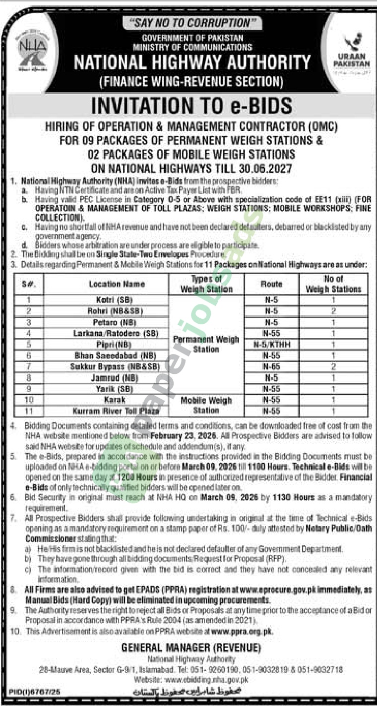 A government tender notice has been issued by NHA, Islamabad. The bid submission deadline is 9 March 2026. Originally published in Daily Jang on 19 February 2026.