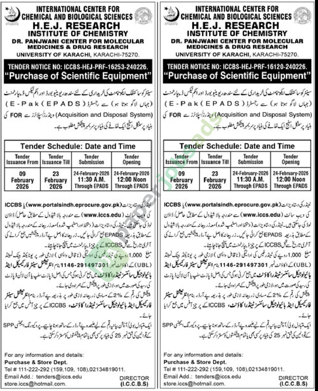 TENDER NOTICE NO: ICCBS-HEJ-PRF-16120-240226.