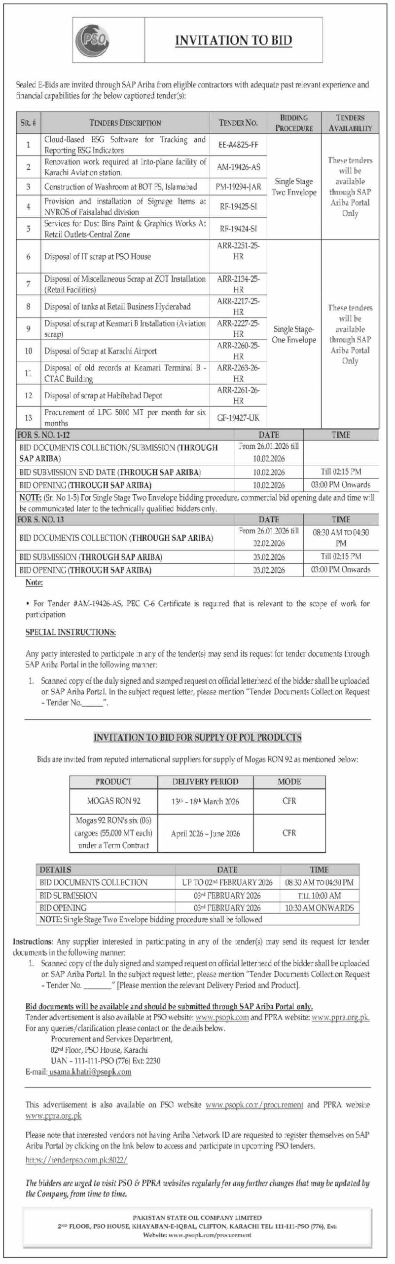 A government tender notice has been issued by PSO, Karachi. The bid submission deadline is 10 February 2026. Originally published in Dawn on 25 January 2026.