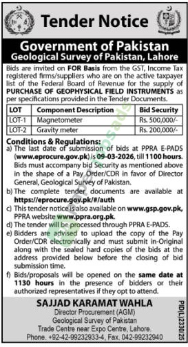 A government tender notice has been issued by Geological Survey of Pakistan, Lahore. The bid submission deadline is 9 March 2026. Originally published in The Nation on 21 February 2026.