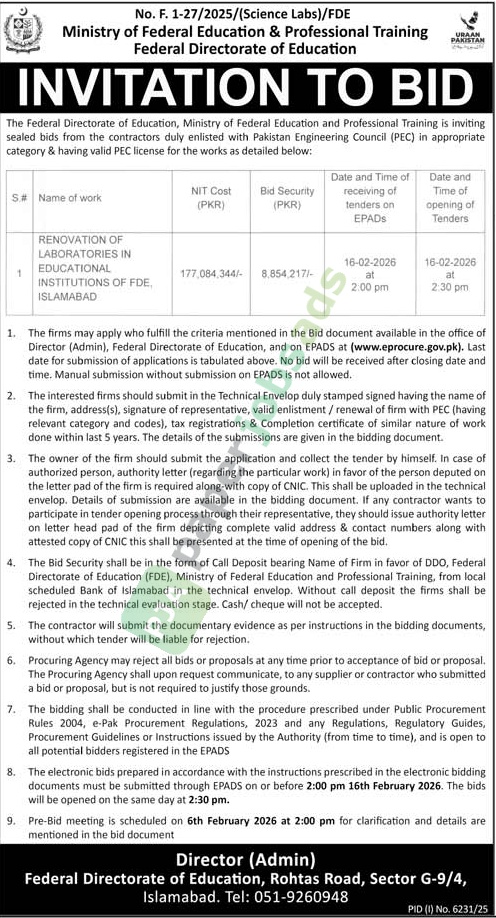 Director (Admin), Federal Directorate of Education, and on EPADS at (www.eprocure.gov.pk). Last