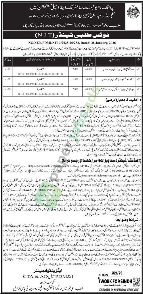 A government tender notice has been issued by Tender Notice – (N.I.T) – Sindh, Karachi. The bid submission deadline is 19 February 2026. Originally published in Daily Jang on 30 January 2026.