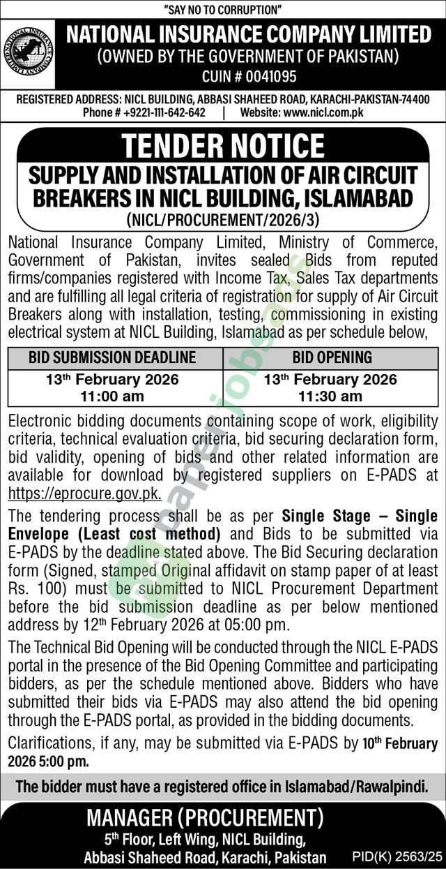 A government tender notice has been issued by NATIONAL INSURANCE COMPANY LIMITED, Karachi. The bid submission deadline is 13 February 2026. Originally published in The Nation on 28 January 2026.