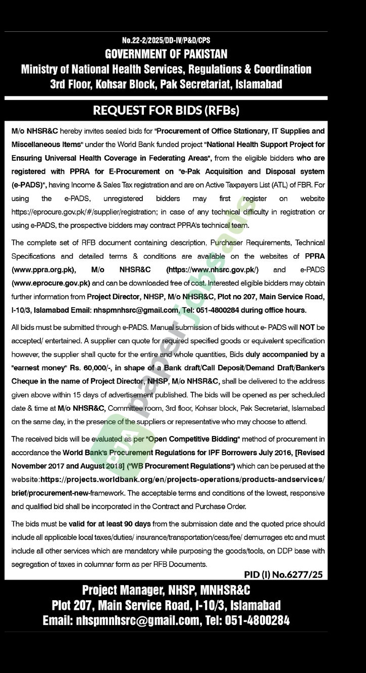 M/O NHSR&C hereby invites sealed bids for “Procurement of Office Stationary, IT Supplies and
