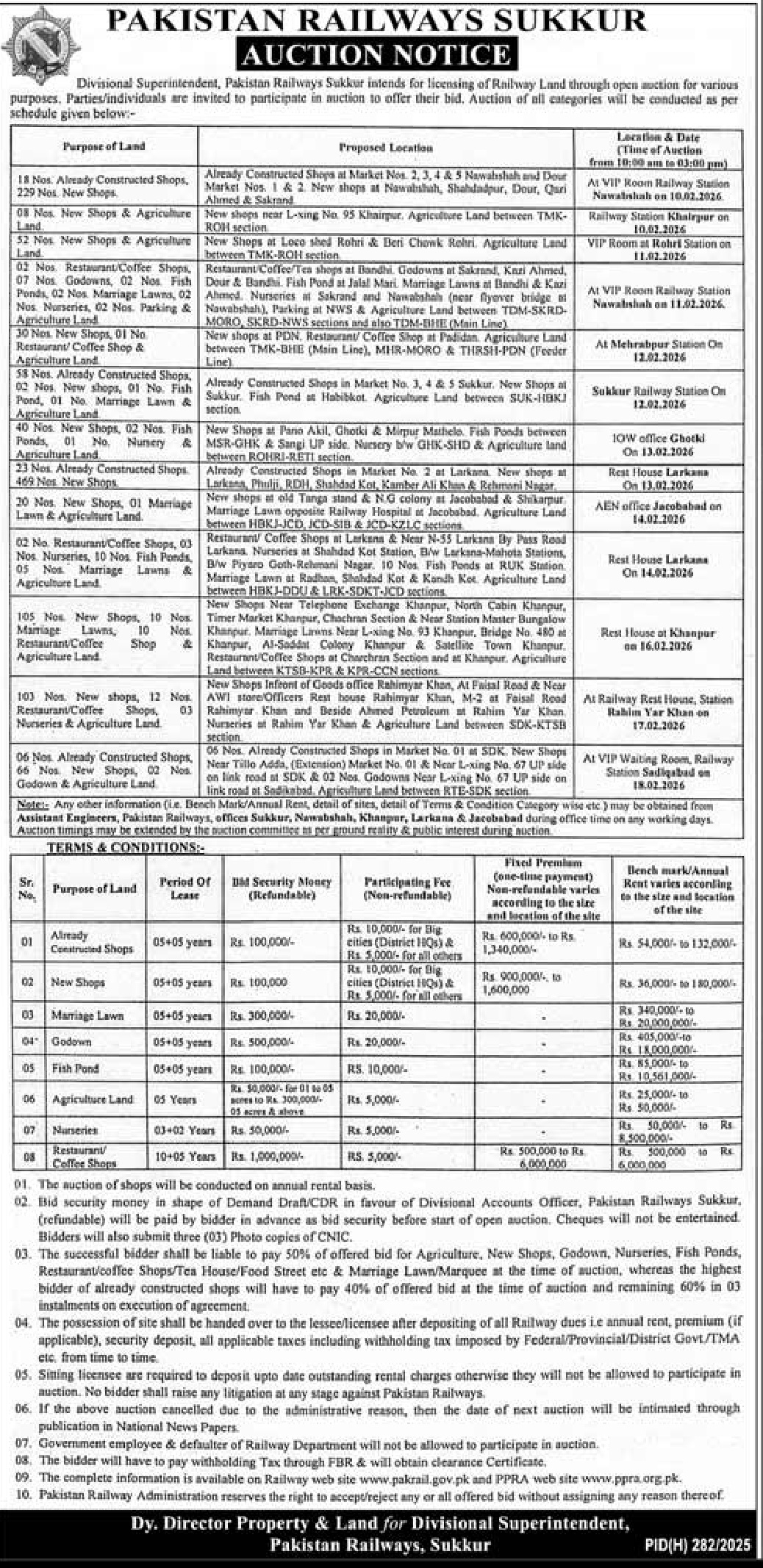 Divisional Superintendent, Pakistan Railways Sukkur intends for licensing of Railway Land through open auction for various