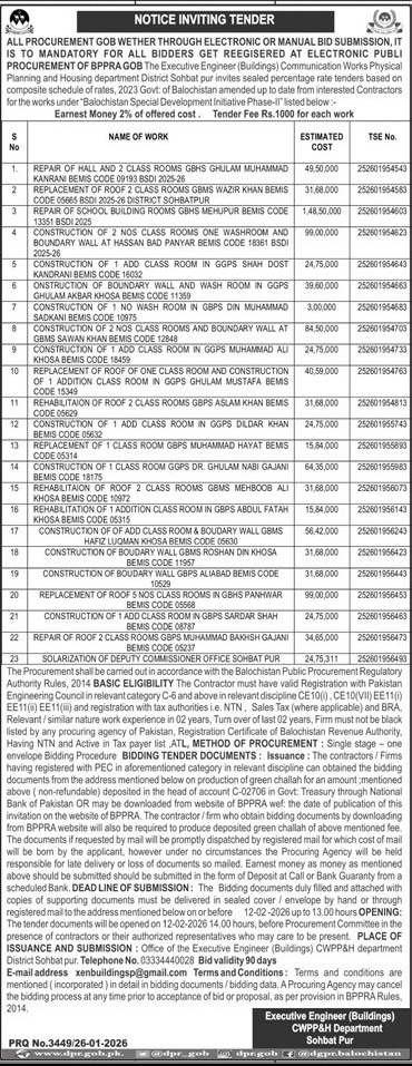 A government tender notice has been issued by Planning and Housing department District Sohbat pur, Sohbat pur. Originally published in Daily Jang on 27 January 2026.