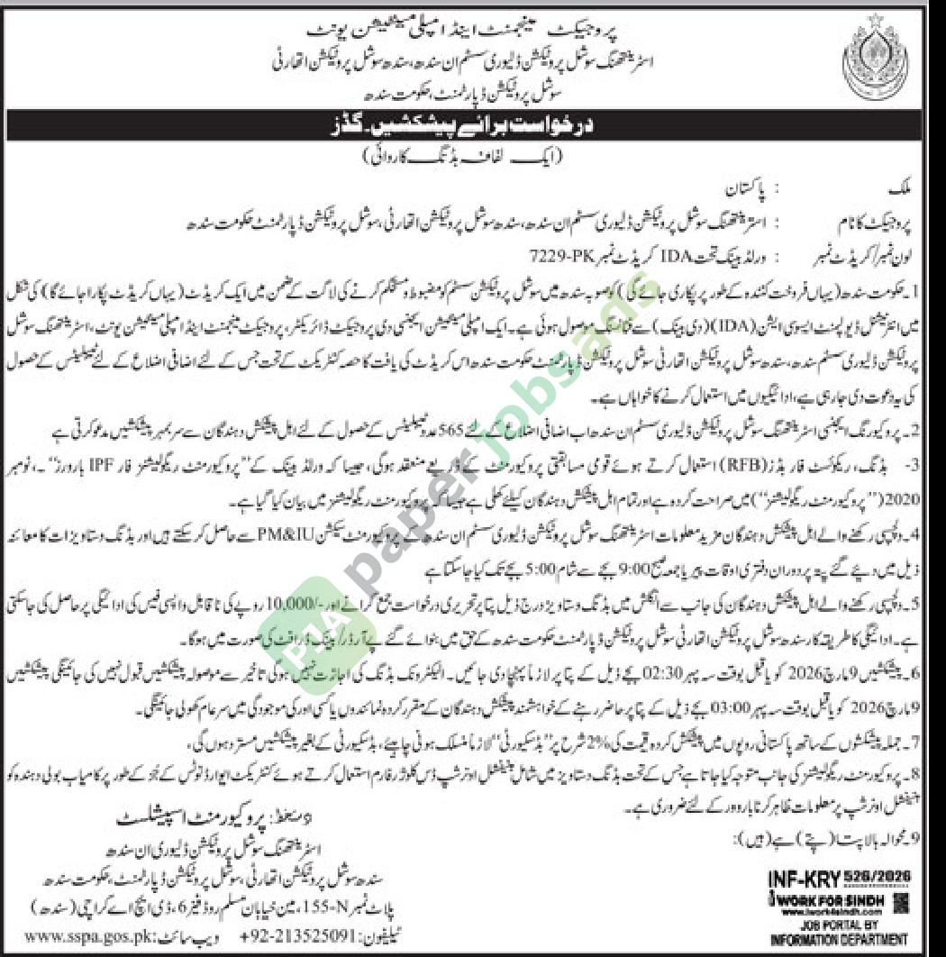 ۔ دلچسپی رکھنے والے اہل پیشکش دہندگان مزید معلومات اسٹریا تھنگ سوشل پروٹیکشن ڈلیوری سسٹم ان سندھ کے پروکیورمنٹ سیکشن PM&IU سے حاصل کر سکتے ہیں اور بڈنگ دستاویزات کا معائنہ