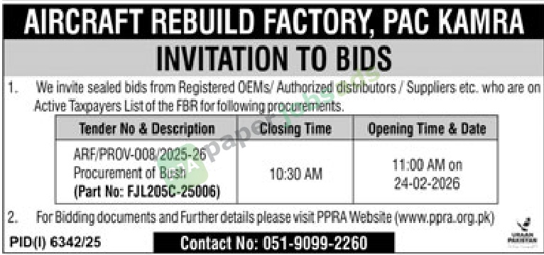 A government tender notice has been issued by AIRCRAFT REBUILD FACTORY, Kamra. The bid submission deadline is 24 February 2026. Originally published in Daily Jang on 4 February 2026.