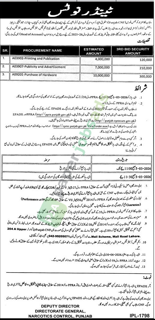 A government tender notice has been issued by Punjab Counter Narcotics Force (CNF), Lahore. The bid submission deadline is 5 March 2026. Originally published in Daily Jang on 20 February 2026.