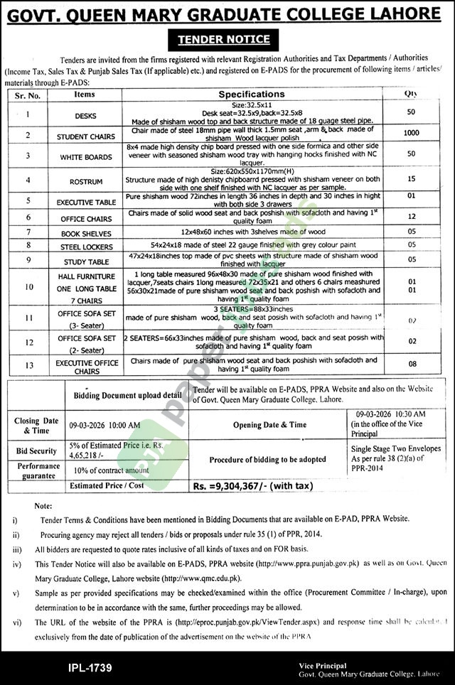 A government tender notice has been issued by GOVT. QUEEN MARY GRADUATE COLLEGE, Lahore. The bid submission deadline is 9 March 2026. Originally published in The Nation on 18 February 2026.