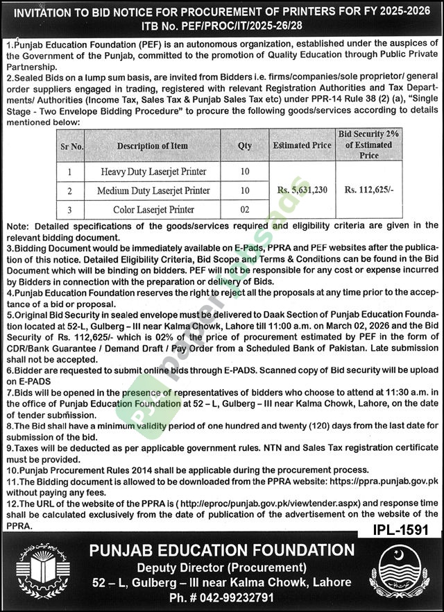 Tender Notice – Punjab Education Foundation – Lahore
