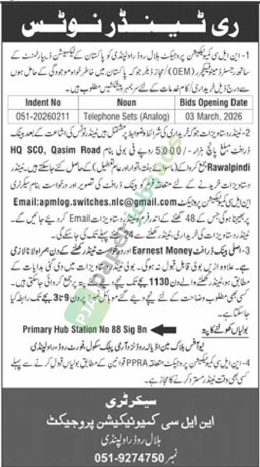 A international tender notice has been issued by NLC, Rawalpindi. The bid submission deadline is 3 March 2026. Originally published in Daily Jang on 18 February 2026.