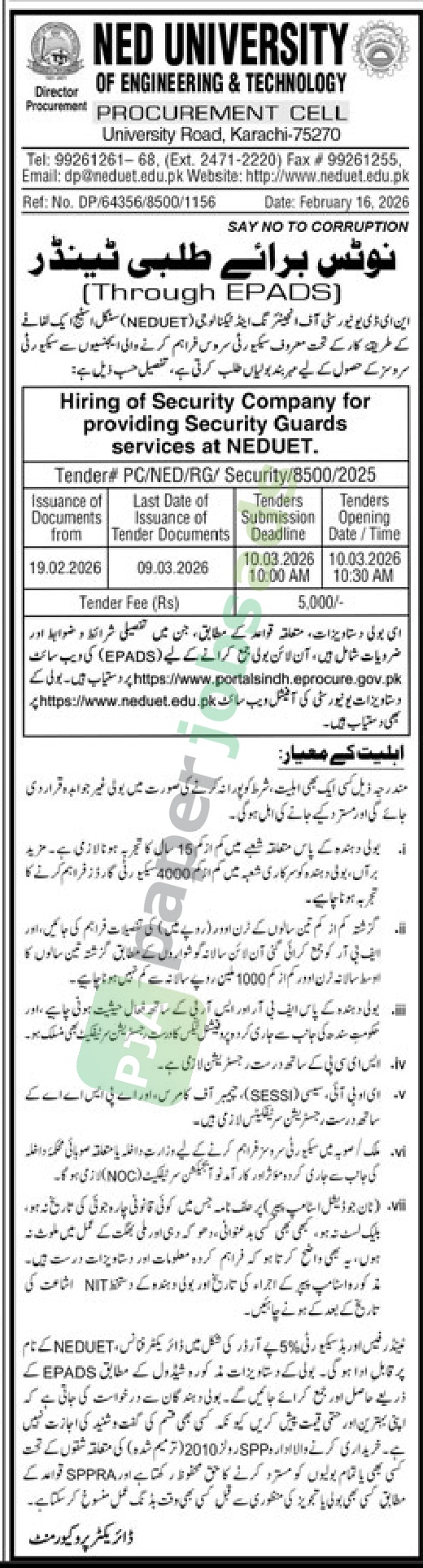 Tender Notice – NED UNIVERSITY – Karachi